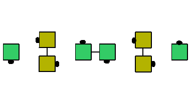 ![]() Within each diamond the centers remain centers and the points remain points. But as the diamonds counter rotate, the role of a particular dancer in the overall formation (e.g., very center, out-facing point) will change. Note also that the square must "breathe" when the diamonds counter rotate. This is because the points of a diamond are further apart than the centers. So when the two diamonds are "point-to-point", their center points will need to be further apart than when they are adjacent with a wave down the middle. The center points of the two diamonds will actually move on the dance floor -- but each dancer will remain the same distance from the center point of his or her own diamond.
