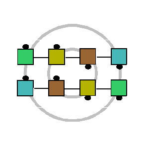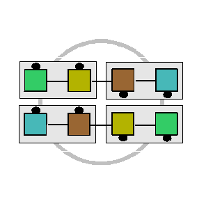 5.1: PARALLEL TWO-FACED LINESIn the case of parallel two-faced lines, everybody has the same shoulder toward the center point of the square (either all left shoulder or all right shoulder), so when they do a counter rotate they will all be moving in the same direction around the center point.Everybody moves in their own circle, staying the same distance from the center point, so the ends stay ends and the centers stay centers. The leaders stay leaders and the trailers stay trailers. The beaus stay beaus and the belles stay belles. Everybody can keep holding hands throughout the call, just like in an ordinary Box Counter Rotate.